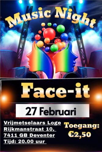 Op vrijdag 27 februari 2026 organiseert werkgroep Face-It een Music Night bij de Loge van de Vrijmetselaars (Rijkmanstraat 10 in Deventer). Een avond om te dansen, te ontmoeten en gewoon plezier te maken. Met goede muziek en fijne mensen; kortom een plek waar je jezelf kunt zijn.