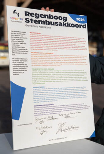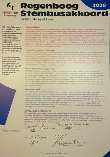 Het COC Deventer & omstreken is blij met de steun van de partijen voor het akkoord. “De gemeente Apeldoorn heeft afgelopen jaren goede stappen gezet voor LHBTI-emancipatie, maar er is ook nog veel te doen”, aldus Rens van der Borg, bestuurslid van het COC Deventer. “Met de ondertekening geven deze partijen zich voor de komende periode een duidelijke opdracht om zich in te zetten voor de regenbooggemeenschap en dit structureel onderdeel te maken van het beleid.”