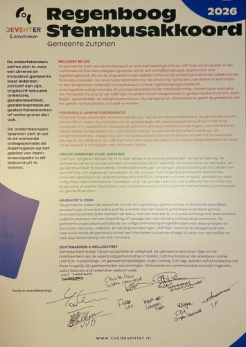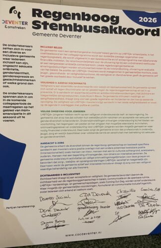Het COC Deventer & omstreken is positief over de bijna unanieme steun van het akkoord. “De gemeente Deventer heeft zich afgelopen jaren sterk en positief ingezet voor LHBTI-emancipatie, maar dit is nooit een vanzelfsprekendheid”, zegt Rens van der Borg, bestuurslid van het COC Deventer. “Met de ondertekening door deze partijen is er ook voor de komende coalitie én oppositie een duidelijke opdracht om zich in te blijven zetten voor de regenbooggemeenschap.”